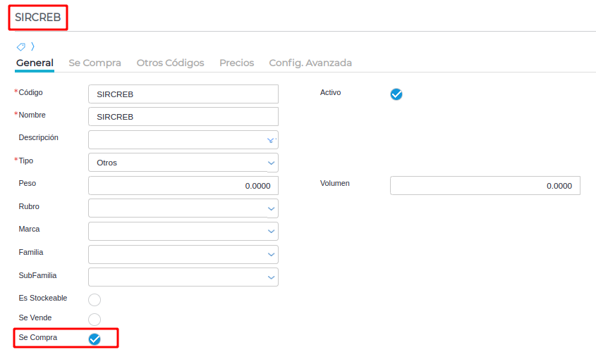Click en “Nuevo”. Cargar la retención como producto dando click en el check “Se Compra”