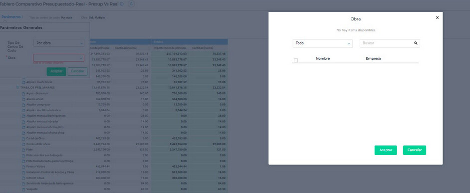 Seleccionar “Tipo de centro de costo: por obra” y elegir la obra correspondiente.