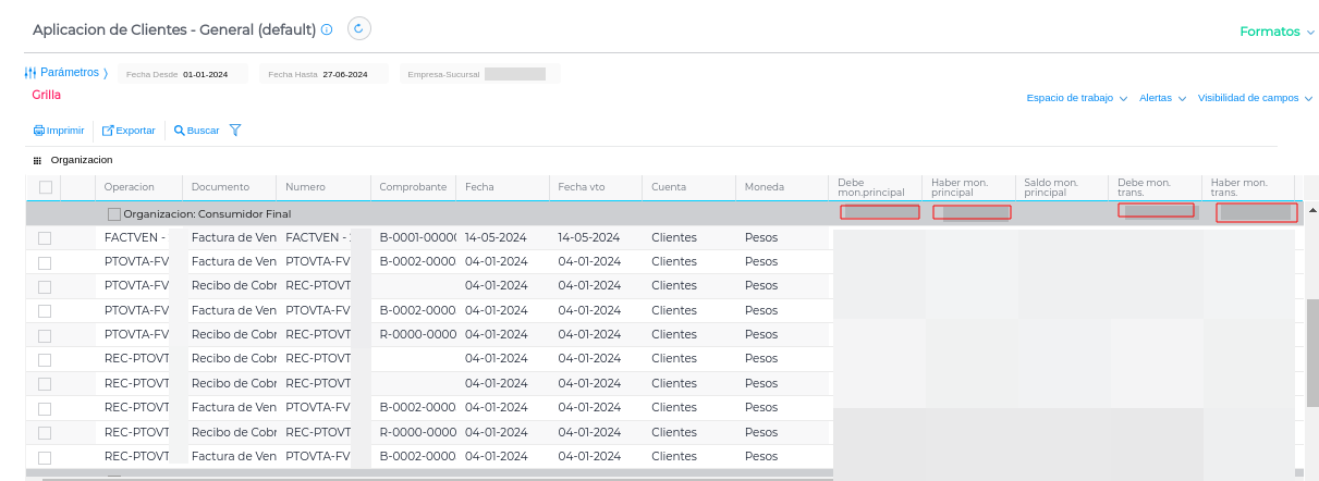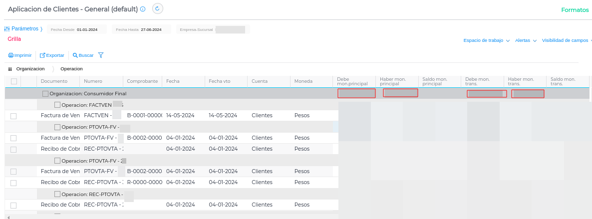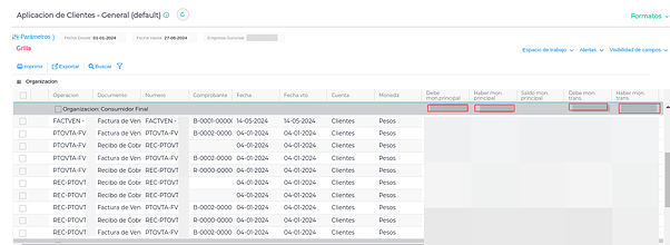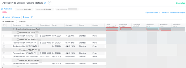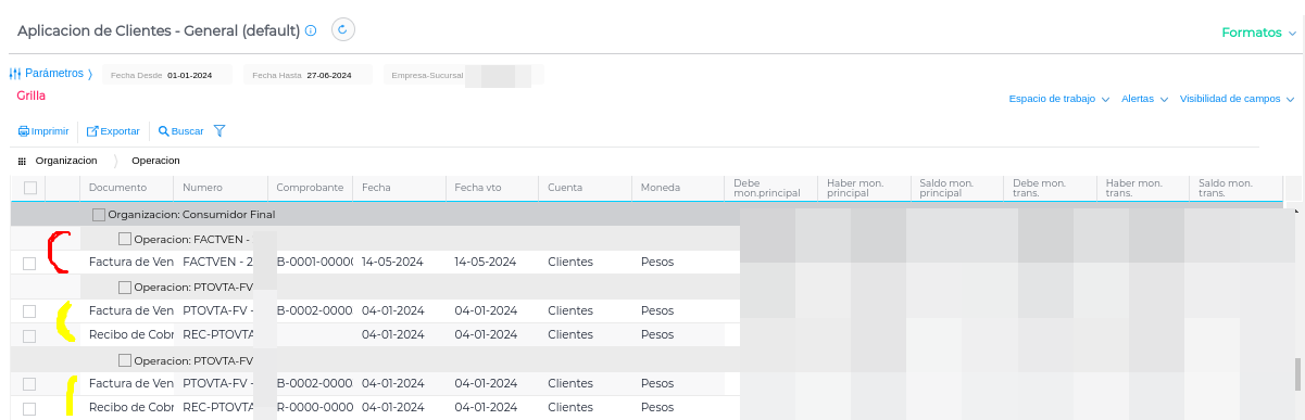 También se puede agrupar por la operación y ver lo que está adentro. Si aparece la Factura junto a la cobranza, es lo que está aplicado. Si aparece sola, la Factura de venta es que no están aplicados.
