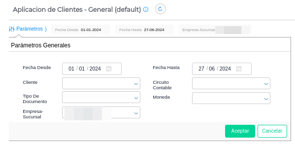 - Ingresar desde Gestión empresarial → Ventas → Informes → Aplicación de Clientes