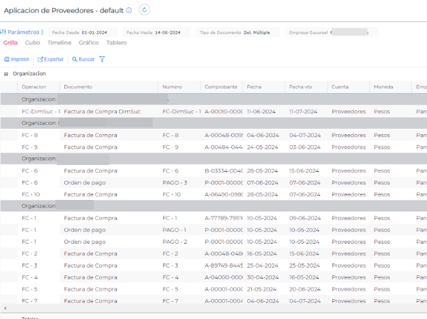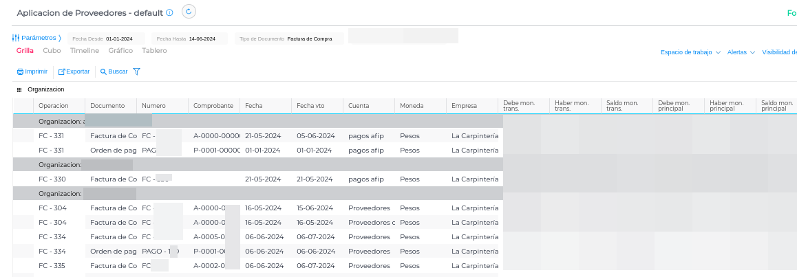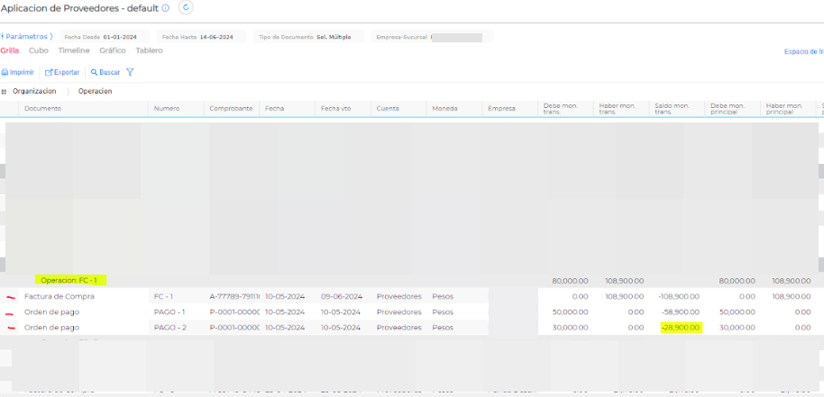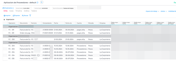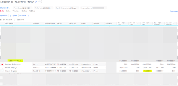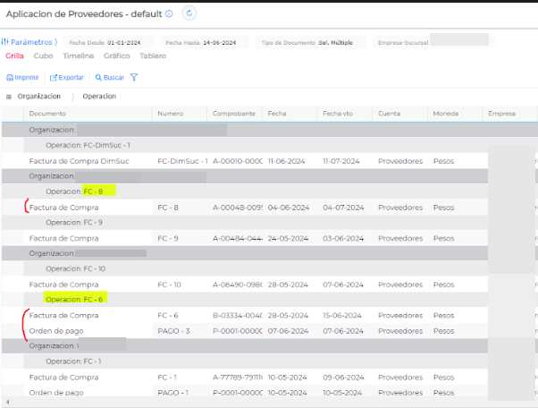 También se puede agrupar por la operación y ver lo que está adentro. Si aparece la Factura junto a la Orden de pago, es lo que está aplicado. Si aparece sola la Factura de compra es que no están aplicados.