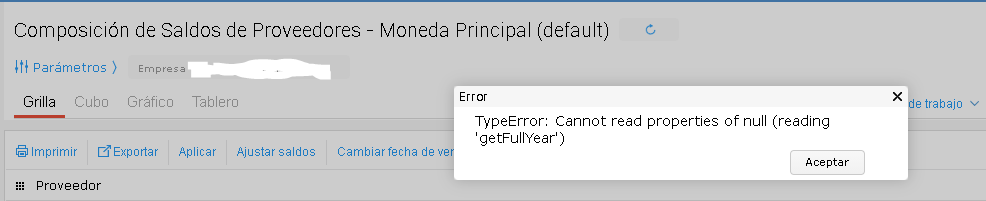 El sistema emite el siguiente mensaje de advertencia “TypeError: Cannot read properties of null (reading ‘getFullYear’)” a la hora de aplicar documentos desde el informe de “Composición de saldos” sea de clientes o de proveedores.