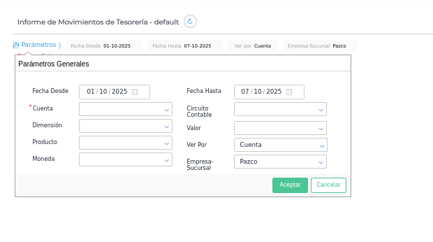 Para generar el Informe de movimientos de tesorería, es necesario configurar los siguientes parámetros obligatorios: