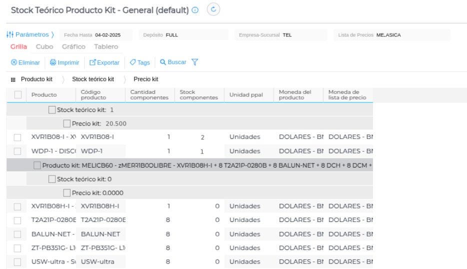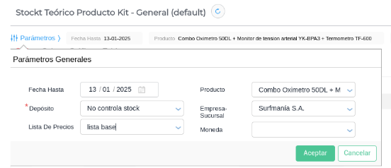 El reporte mostrará la cantidad de componentes que se necesitan para conformar el producto kit y la cantidad disponible en stock que hay de esos componentes según la fecha y el depósito filtrado. A partir de estos datos, mostrará el stock teórico que se puede conformar de dicho producto kit.