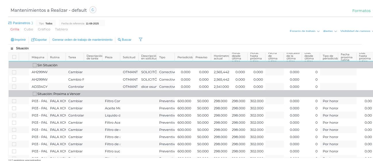Este informe permite consultar todas las tareas de mantenimiento preventivo programadas para un período determinado, ya sea por equipo, por fecha, o por tipo de mantenimiento.
