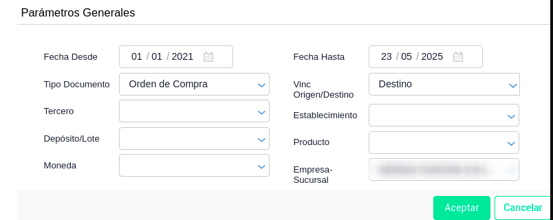 - Ir a Menú → Gestión Empresarial → Compras→ Informes → Vinculación de operaciones`.