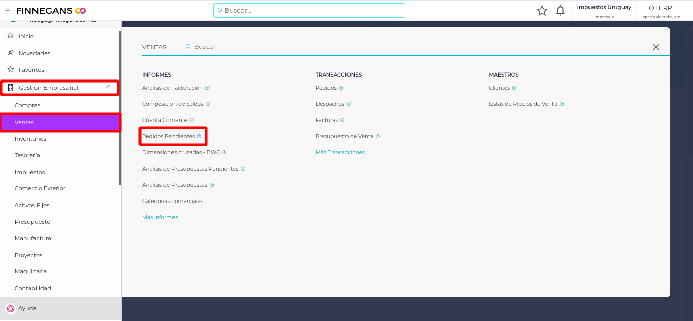 Ingresar al informe deseado. Por ejemplo: Gestión empresarial > ventas > informes > pedido de venta.