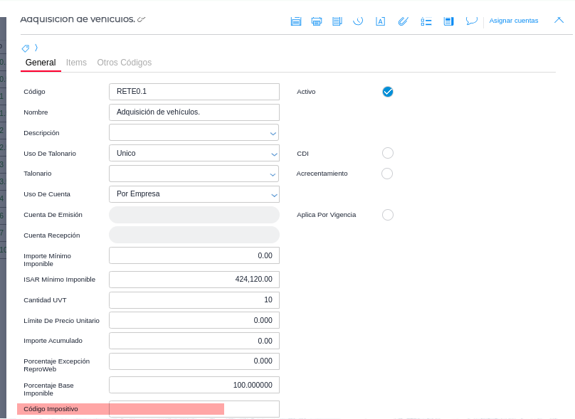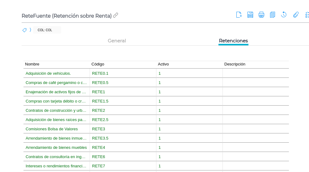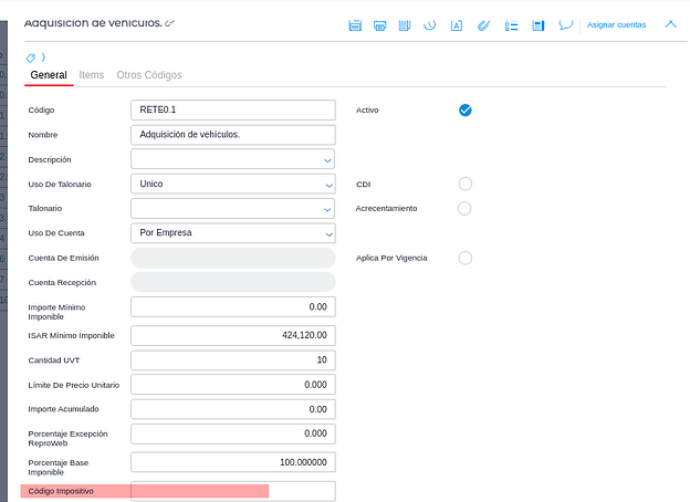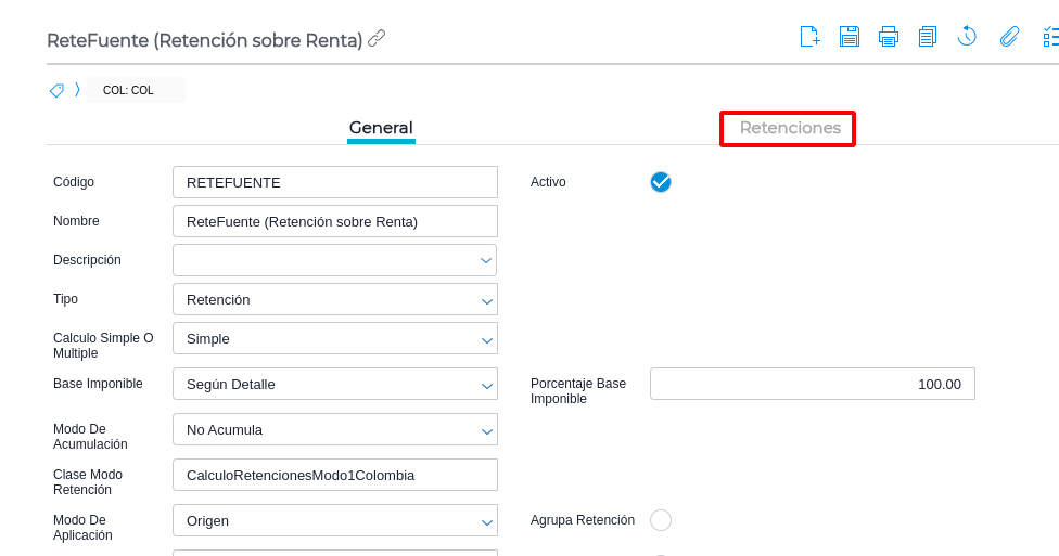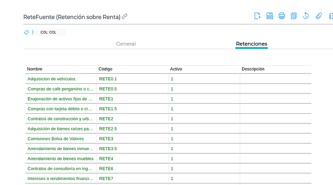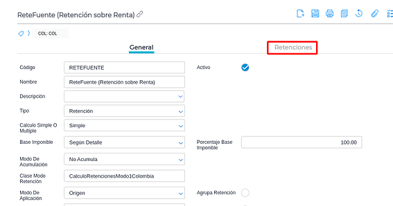 Configurar el código de la retención de interés, que responde a la tabla Art. 18 de la Resolución 1255/2022 sólo informará aquellas retenciones que tengas un código configurado, dicho código se informará en la columna concepto del informe.