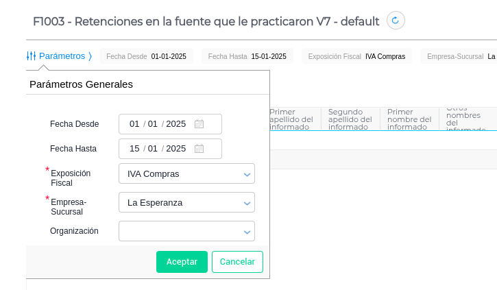 En caso de querer ver sólo las retenciones de una organización seleccionar la organización de interés, sino dejar el campo vacío y el sistema traerá todas las organizaciones configuradas.