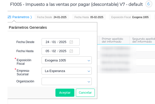 - Punto 1: Completar los parámetros con la exposición fiscal previamente configurada y la empresa-sucursal que es el espacio de trabajo en el que se está trabajando.