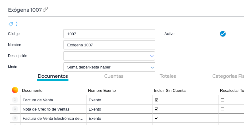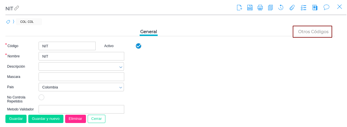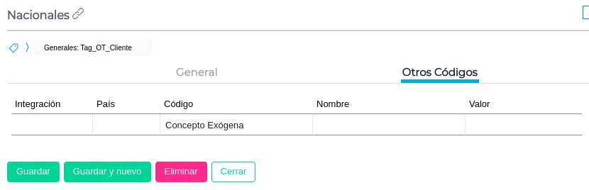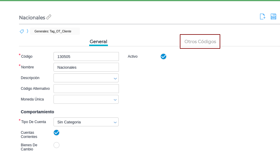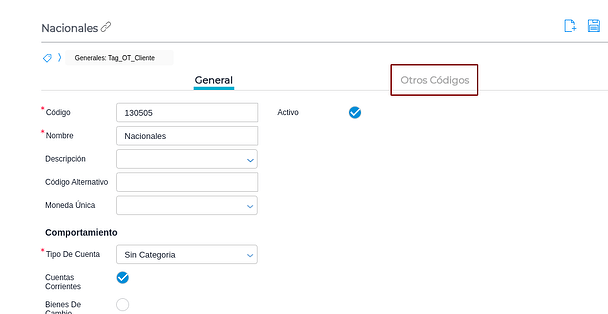 EJ: Maestro de cuentas →Nacionales → Otros Códigos