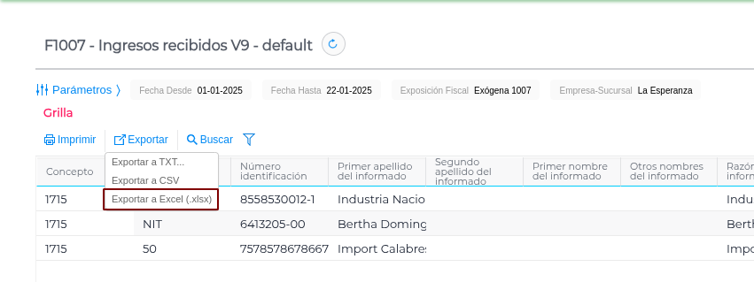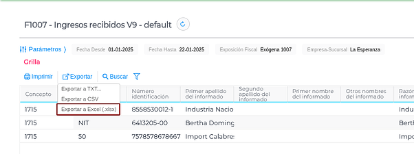 Menú → Gestión Empresarial → Impuestos → Exógena Dian