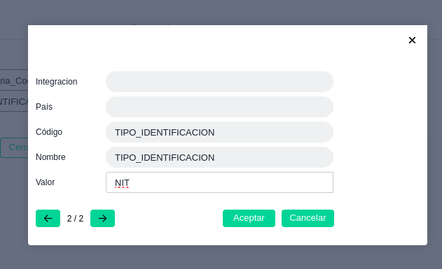 Ingresamos al codigo TIPO_IDENTIFICACION configuramos el valor damos aceptar y guardamos los cambios en la identificación tributaria