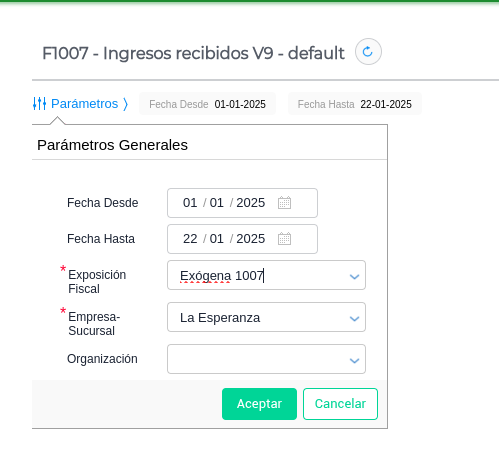 - Punto 1 (*): completar la exposición fiscal previamente configurada y la empresa-sucursal que es el espacio de trabajo en el que se está trabajando.