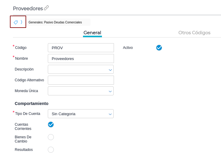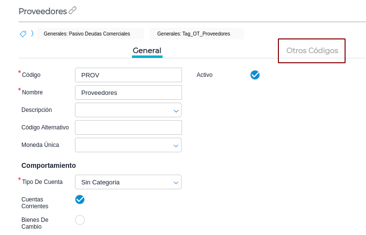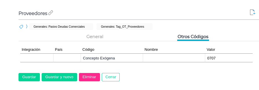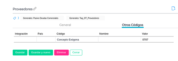 Maestro de cuentas →Proveedores → Otros Códigos