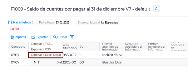 - Punto 2: Se podrá exportar a un archivo excel para poder utilizar el prevalidador suministrado por la Dian, generar el TXT para luego subir a la página de la Administración Tributaria.
