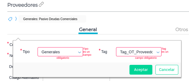 EJ: Maestro de cuentas →Proveedores → Tag