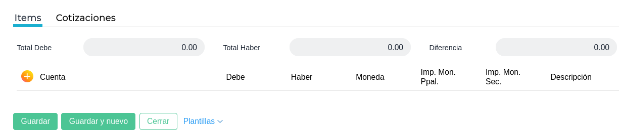 - Diferencia: diferencia entre el total del Debe y el Haber. Si existe, el asiento no está balanceado.