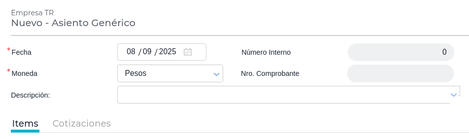 - Número de Comprobante: número asignado según el talonario configurado para el tipo de documento. En los asientos genéricos no suele utilizarse, pero puede habilitarse si el usuario lo requiere.