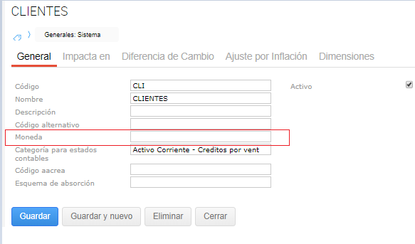 En este tipo de cuentas no se indica moneda ya que con un mismo tercero pueden tenerse transacciones en distintas monedas. El campo se dejará en blanco.