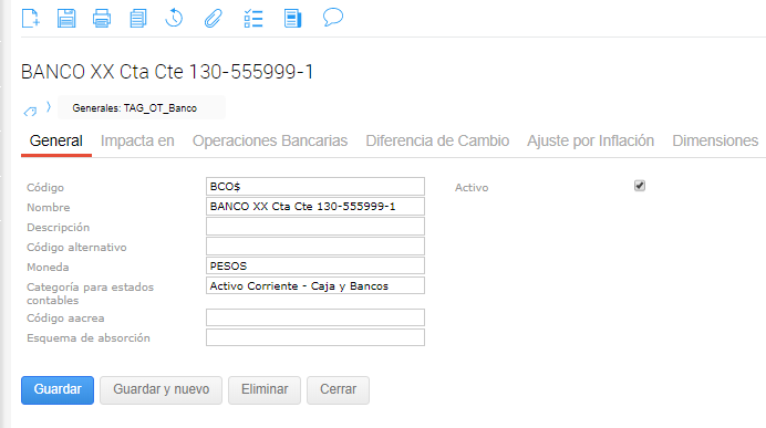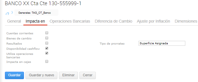 Utiliza operaciones bancarias: todas las cuentas de banco tienen que tener esta opción marcada. Esto hace que al utilizar esta cuenta en un pago, cobro, asiento etc. se exija una operación bancaria que de acuerdo al tipo de operación que se trate exigirá más o menos campos. Una operación bancaria es por ejemplo “emisión de cheque propio” depósito bancario, transferencia etc.