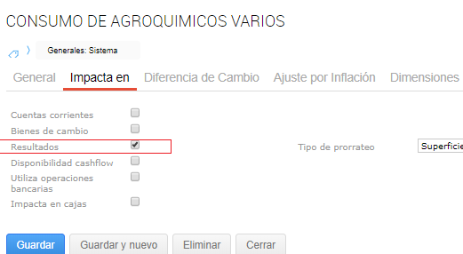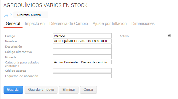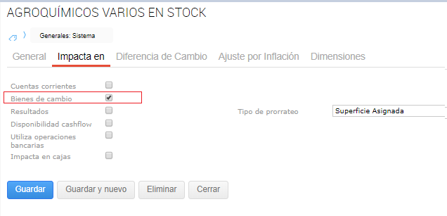 Este tipo de cuentas requiere que la solapa “impacta en” este marcado el check ”bienes de cambio”. Cuando se utilice una cuenta de este tipo se deberá indicar un producto.
