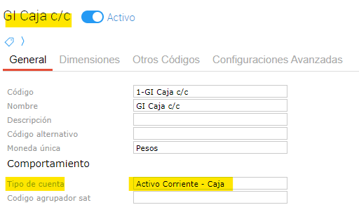 En el maestro de cuentas el registro GI Caja c/c puede visualizar el tipo de cuenta Activo Corriente - Caja