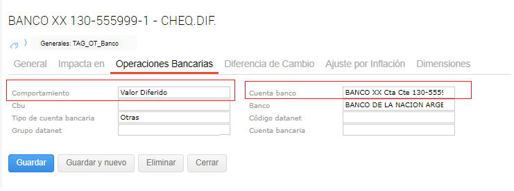 El comportamiento es “valor diferido”. Este comportamiento habilita el campo “cuenta banco” donde se indica la cuenta contable de banco que regulariza.