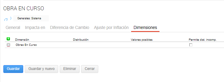 En la solapa dimensiones, se configurara que utiliza la dimensión “obra en curso”. Cuando se utilice este tipo de cuenta contable, se exigirá ingresar un valor de dimensión obra en curso (es decir, a que obra en curso se imputa )