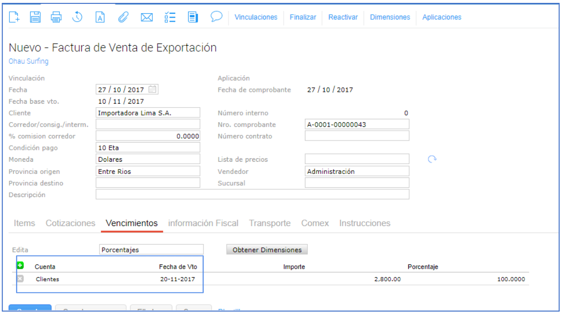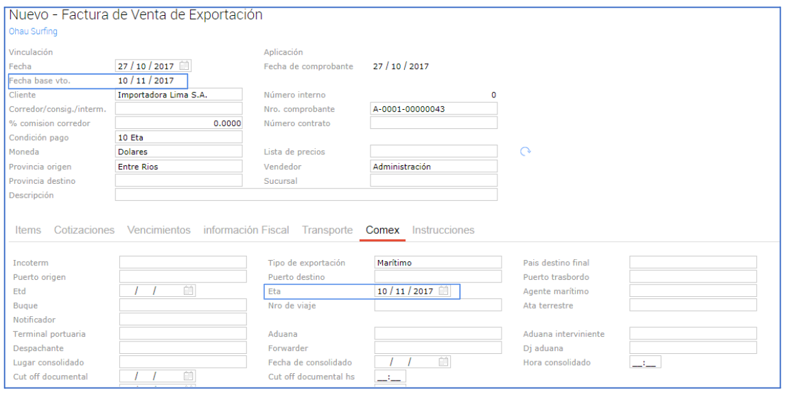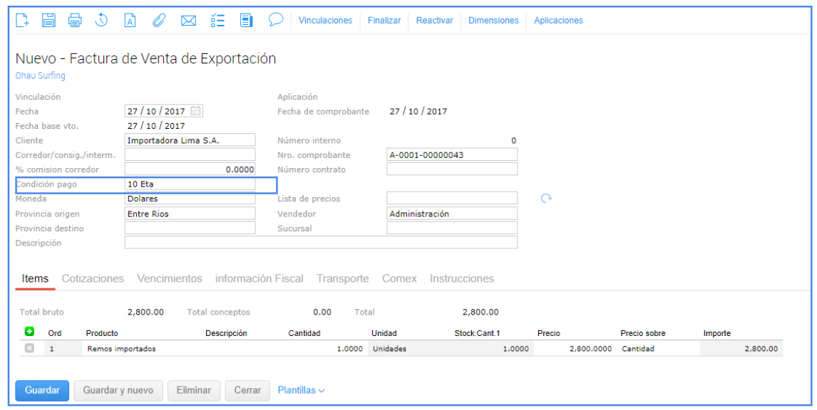 Se realiza una Factura de Venta de Exportación se selecciona como condición de pago la condición configurada previamente 10 ETA.