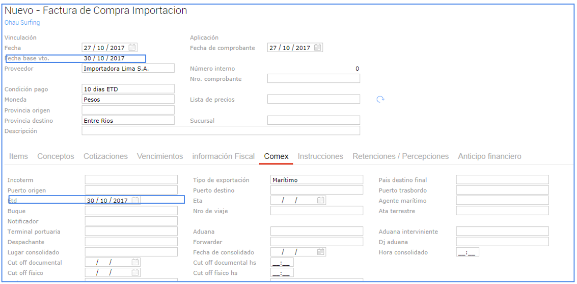 Al ingresar a la solapa Comex, se observan los campos ETA y ETD. Si en el campo ETD se ingresa una fecha diferente a la fecha de base de vencimiento, el sistema recalculará la fecha base en función de la nueva fecha seleccionada en el campo ETD.