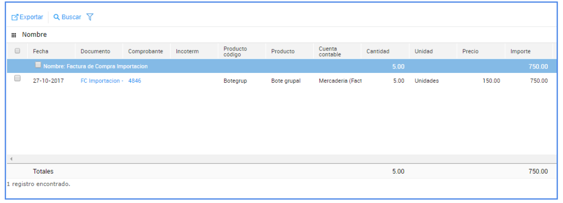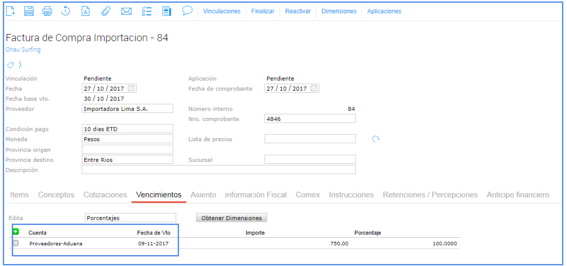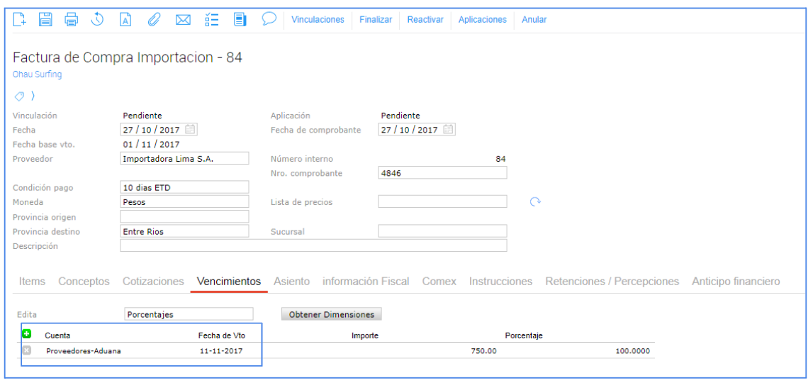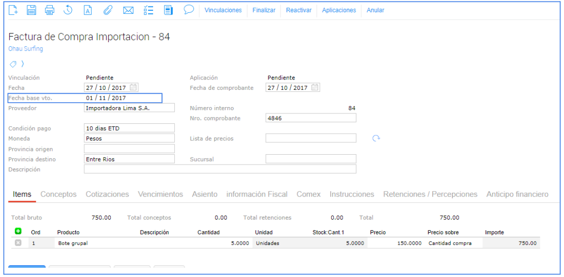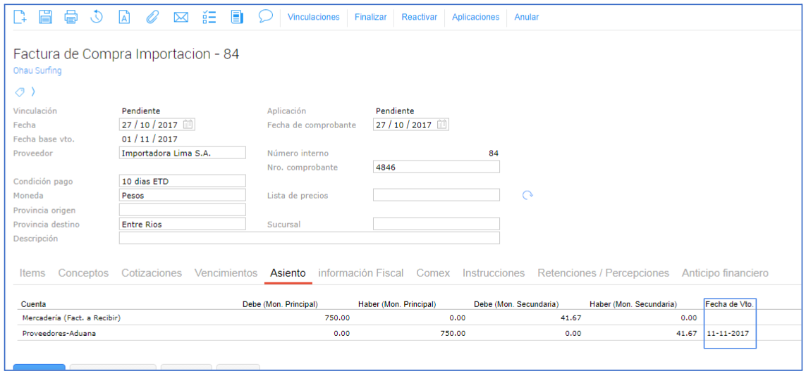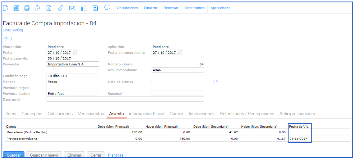 Al ingresar a la factura asociada al legajo de importación, podemos observar que las fechas Base de Vencimiento, Fecha Vencimiento, ETD y Fecha de vencimiento del asiento se actualizaron en función de la Fecha ETD cargada en el legajo