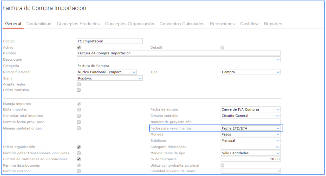 Para poder utilizar esta funcionalidad se debe seleccionar en los tipos de documentos en el campo Fecha para Vencimientos la opción Fecha ETA/ETD.