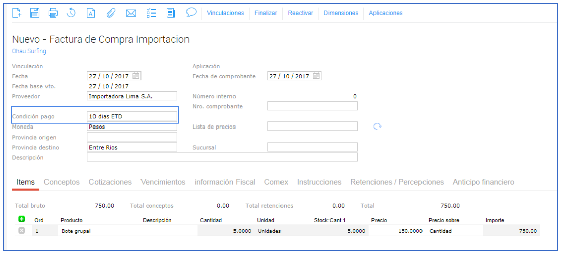 Se realiza una Factura de Compra Importación se selecciona como condición de pago la condición configurada previamente 10 días ETD