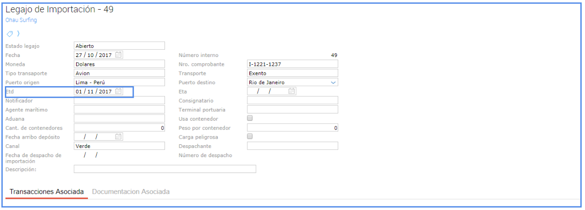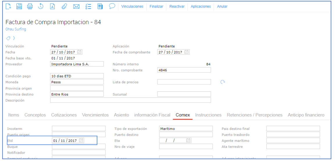 Luego en el legajo de importación, si se actualiza el campo ETD, al guardar, el sistema actualizará el campo en la factura de compra y calculará el nuevo vencimiento de los comprobantes en función de ETD.