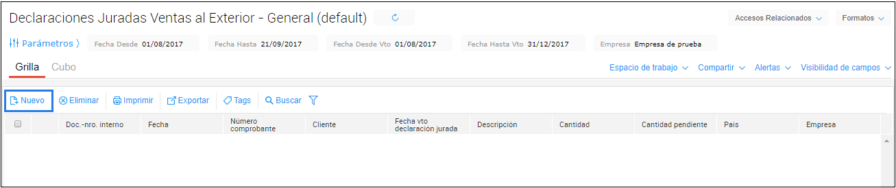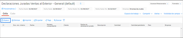 Se accede desde el menú Operaciones → Comercio exterior → Declaraciones Juradas