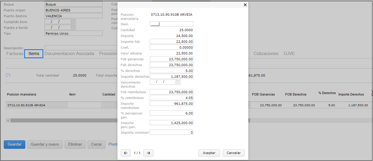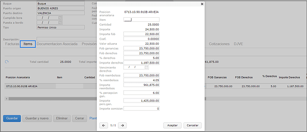 En caso de tener asociada más de una DJVE a un permiso, el sistema calcula la base imponible tomando la cantidad de cada DJVE asociada al permiso, por el precio informado en cada una. La sumatoria de cada valor obtenido por DJVE, compone el valor de los campos FOB (base imponible).