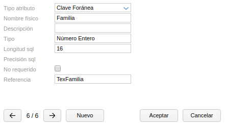 Completá el campo “Tipo atributo” con “Clave Foranea” (ver imagen) y el campo referencia con el nombre del primer diccionario de datos creado (ver imagen). En el nombre físico colocá “Familia”.