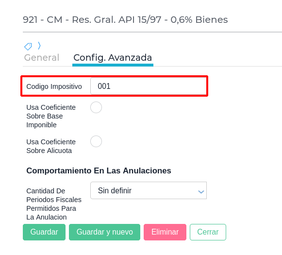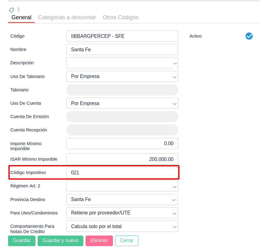 Artículo/Inciso para el cálculo: se informa el código impositivo configurado en la solapa Config. Avanzada de las combinaciones de cálculo del gestor de retenciones y percepciones de ingresos brutos.