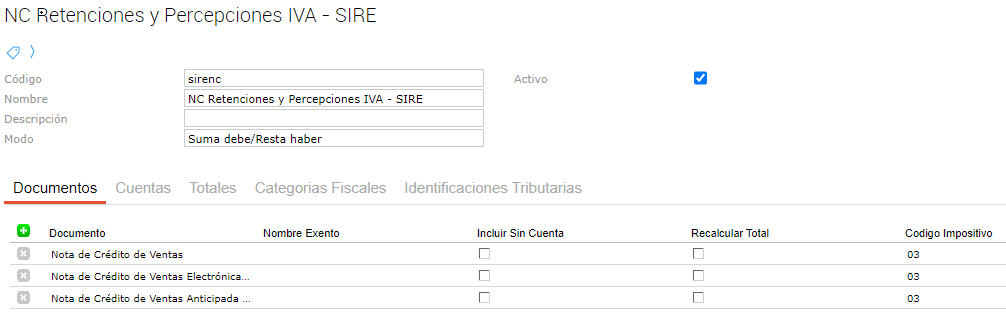Observar que en este caso, el número de código impositivo es 03, como lo indica la tabla de códigos de comprobantes de AFIP. El resto de la configuración de la exposición fiscal es la misma que la configurada previamente para los demás documentos que no son notas de crédito.