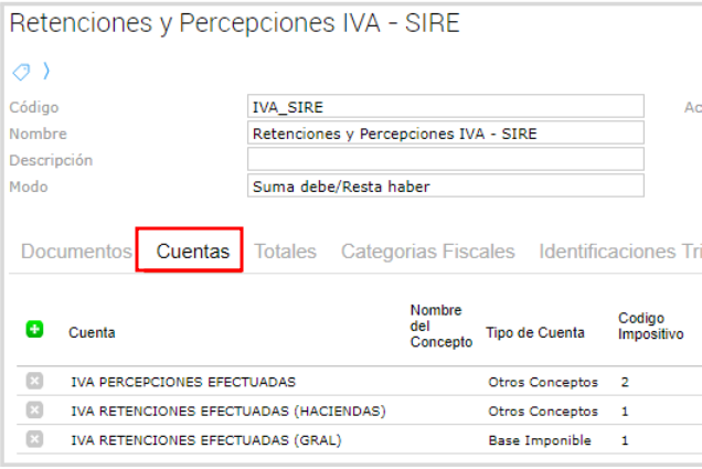 La solapa Cuentas se completará con la cuenta contable de las retenciones y percepciones efectuadas, por ejemplo: