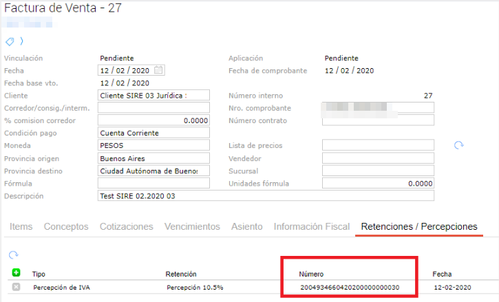 Puede observarse que una vez importado el certificado, la transacción que origina la retención/percepción actualizará el número de retención, pegándose entonces el número de certificado de AFIP. El mismo consta de 25 números: