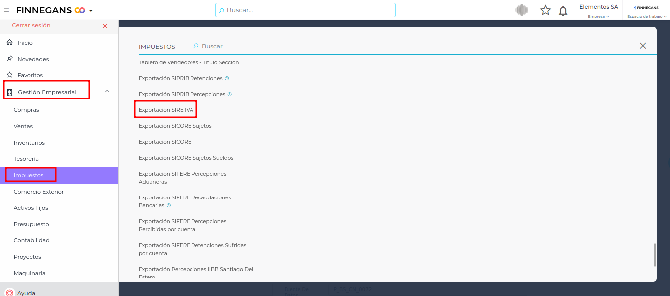 Para la primera etapa, accederemos a este servicio a través de Menú → Gestión empresarial → Impuestos → Aplicativos → Exportación SIRE → Exportación SIRE IVA