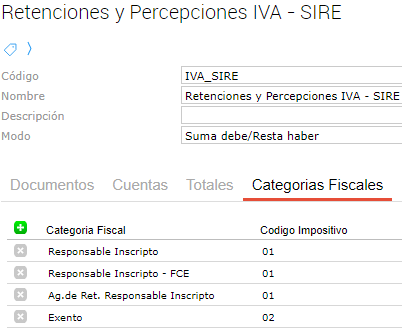 En la solapa de Categorías Fiscales se configurarán las categorías fiscales de los sujetos retenidos, por ejemplo: