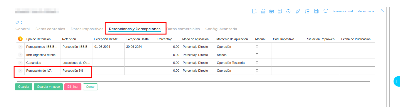 En el proveedor al cual se le deba retener y al cliente al cual se le deba percibir, se les debe configurar la retención/percepción en la solapa Retenciones y Percepciones: