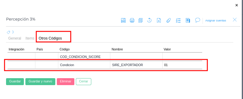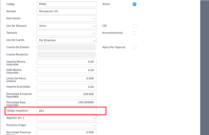 Se utilizan las mismas retenciones y percepciones de IVA que se tengan ya configuradas, pero para cada caso, debe configurarse un código adicional. Por ejemplo: si el concepto de retención tiene el código impositivo 831, el código adicional debe ser “01” (si este concepto de retención se utilizará para Responsables Inscriptos) o “02” (para Responsables No Inscriptos)