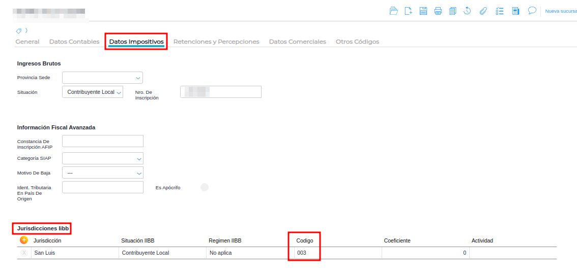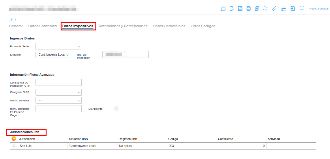 Por último, en la solapa de “Datos Impositivos” sección Jurisdicciones IIBB. debe indicarse la provincia de San Luis, y completar los datos siguientes (Situación IIBB y Código) según corresponda: