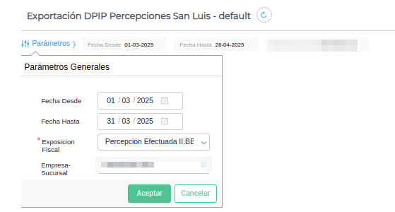 - Exposición Fiscal: debe seleccionarse la exposición fiscal correspondiente a percepciones de San Luis, la cual debe ser creada previamente;