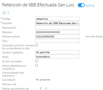 Deberán crearse un nuevo talonario para las retenciones, cuyo formato sea de 12 números (sin guiones).