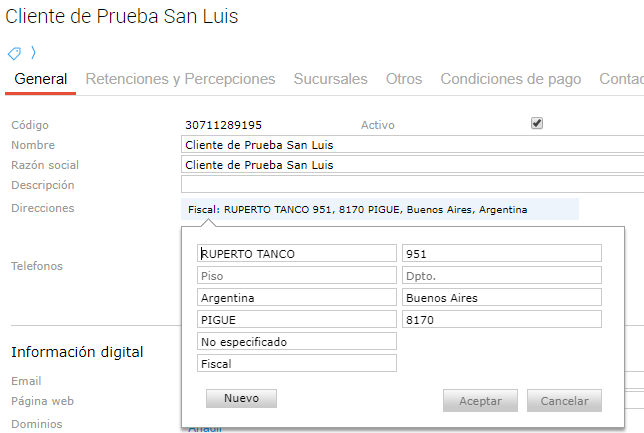 Se debe completar el datos requeridos en la solapa de Direcciones. La dirección que toma el sistema es la dirección fiscal: